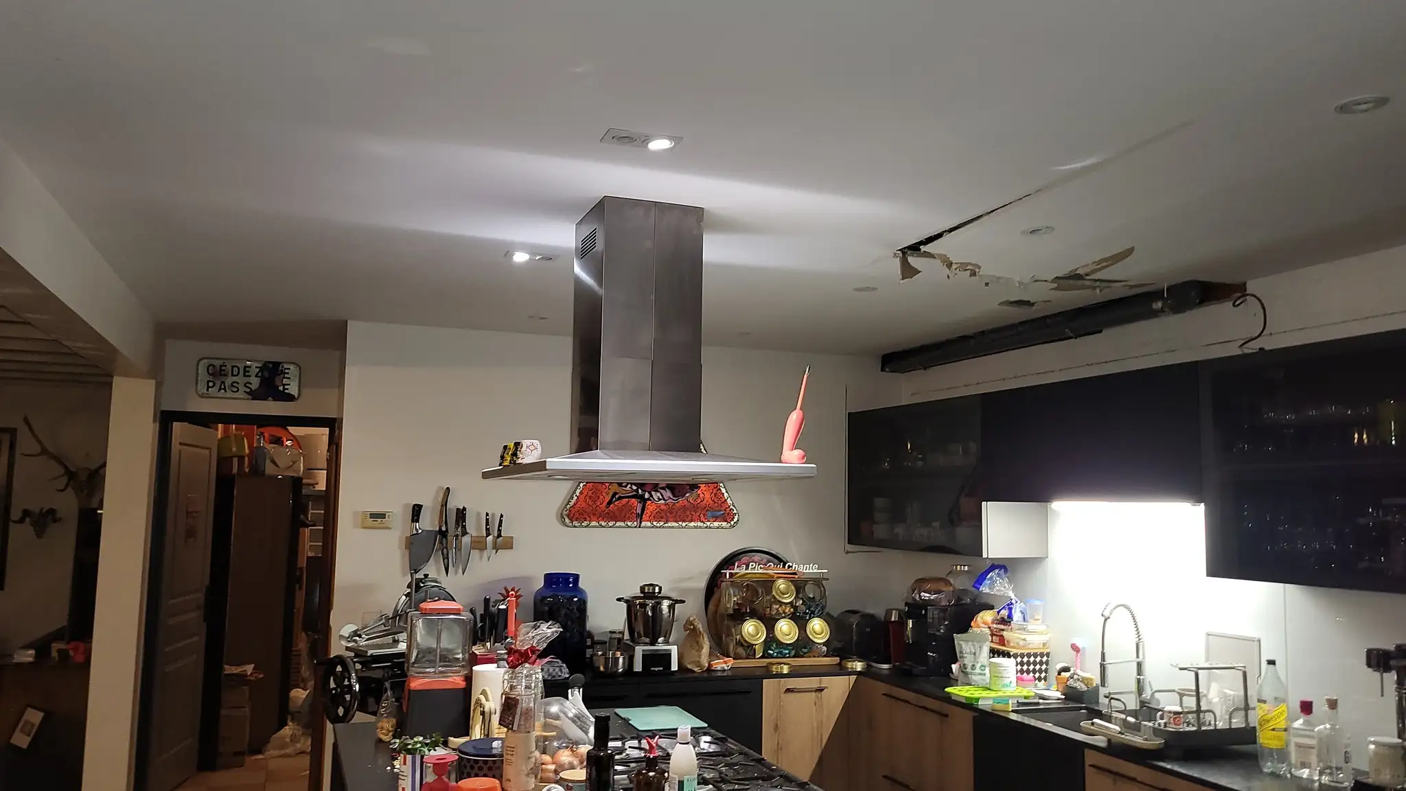 Dans la cuisine, nous avons réalisé la réfection complète du plafond après traitement des zones endommagées, avec application d’une peinture adaptée aux contraintes d’humidité de la pièce. Cette intervention a permis de retrouver un rendu uniforme, lumineux et sain.