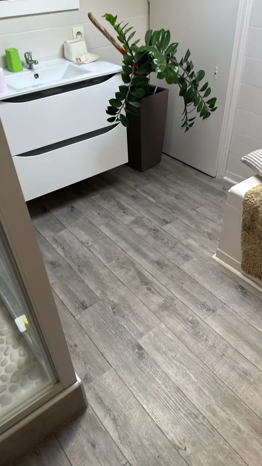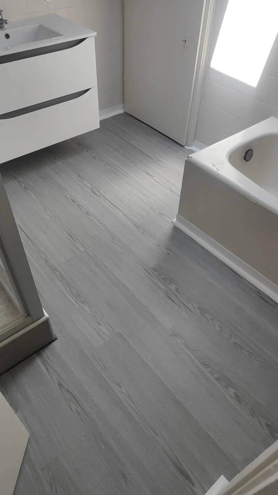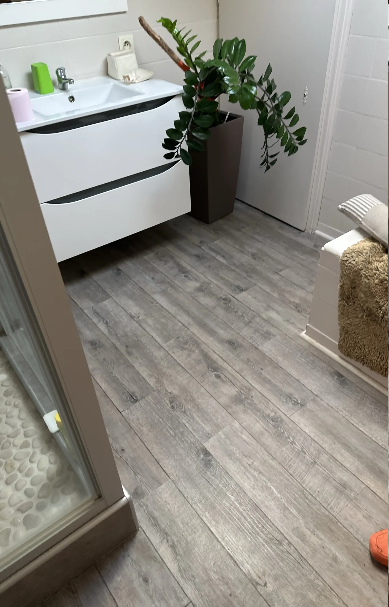 Concernant la salle de bains, le sol a été remplacé en recherchant un revêtement le plus proche possible de l’existant. Dans le cadre d’un sinistre, la remise à l’identique — ou quasi identique — est essentielle afin de correspondre au budget défini par l’expert et l’assurance. Le nouveau sol offre ainsi une continuité esthétique avec la pièce tout en assurant résistance et facilité d’entretien.