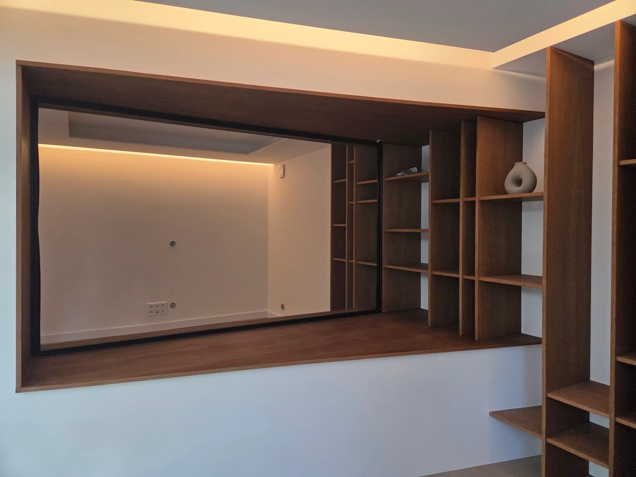 Nous avons également assuré une coordination avec les autres entreprises intervenantes, notamment pour les travaux d’électricité avec l’intégration de bandes LED, ainsi que pour la réalisation et la pose d’une bibliothèque en bois sur mesure.
